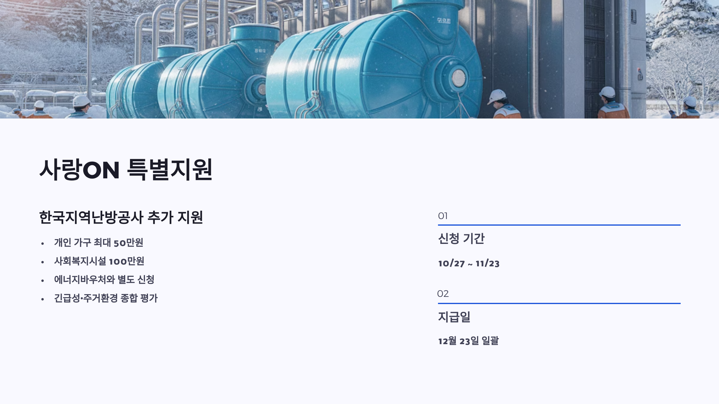 한국지역난방공사의 사랑ON 사업은 에너지바우처와 별도로 신청 가능한 추가 지원입니다. 개인 가구는 최대 50만원, 사회복지시설은 100만원까지 지원받을 수 있으며, 10월 27일부터 11월 23일까지만 신청 가능합니다.