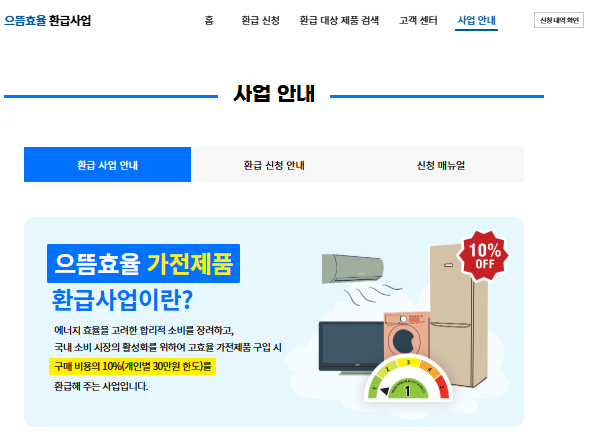 이 사업은 에너지 절약형 가전제품 보급 확대와 소비자 부담 완화를 위해 정부가 직접 예산을 투입해 진행하는 제도예요. 대상 제품을 구입하면 구매 금액의 10%를 현금으로 환급받을 수 있고, 1인당 최대 30만원까지 지원돼요.