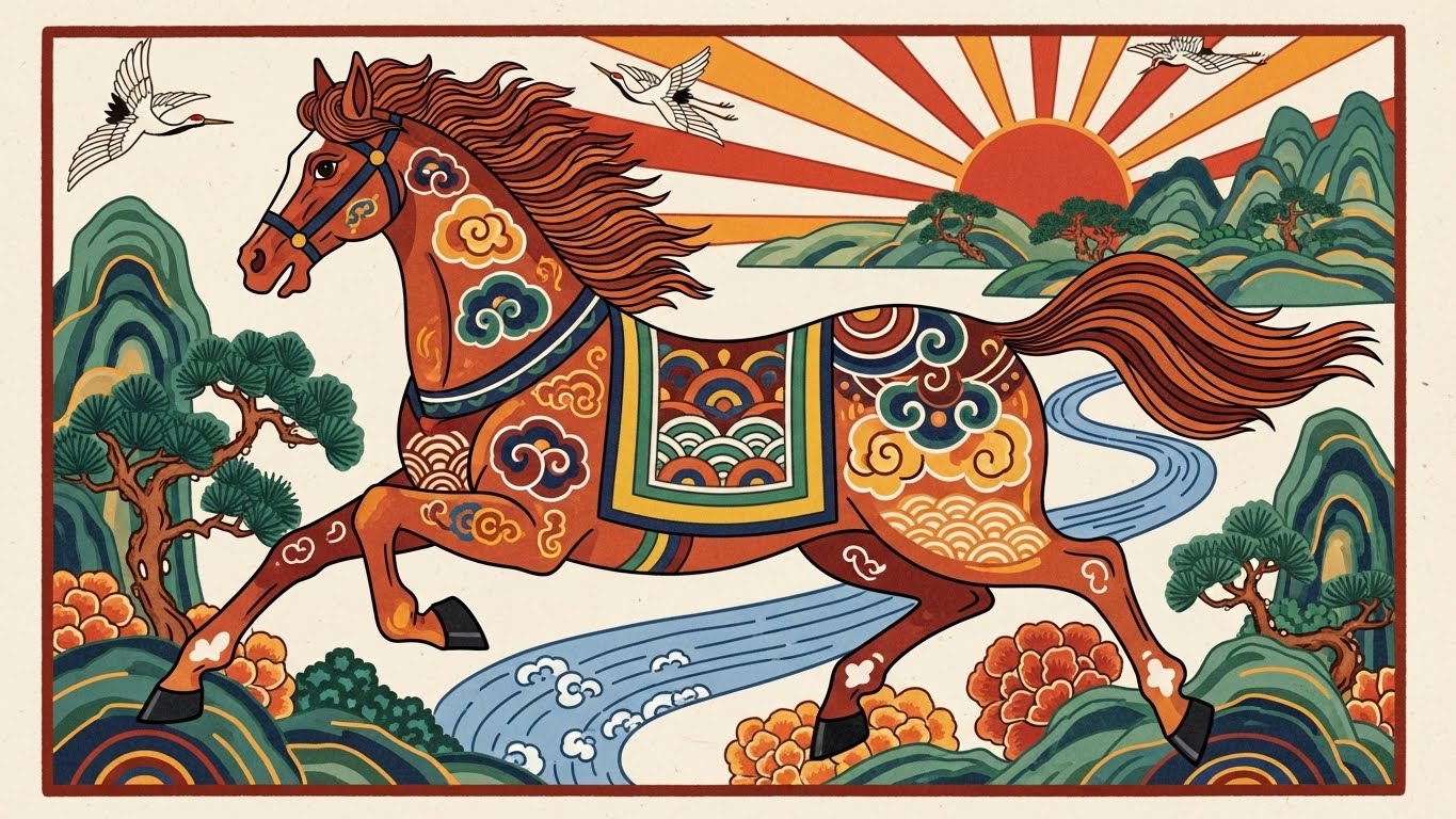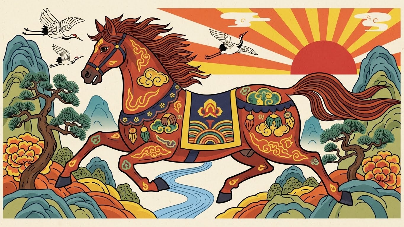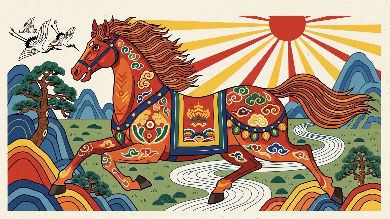 말은 한국 민속문화에서 생명력, 지혜, 충성, 신성함을 상징합니다. 이승과 저승을 오가는 신성한 존재로 인식되어 왔으며, 조선시대 왕비들도 많이 말띠 해에 태어났습니다.
