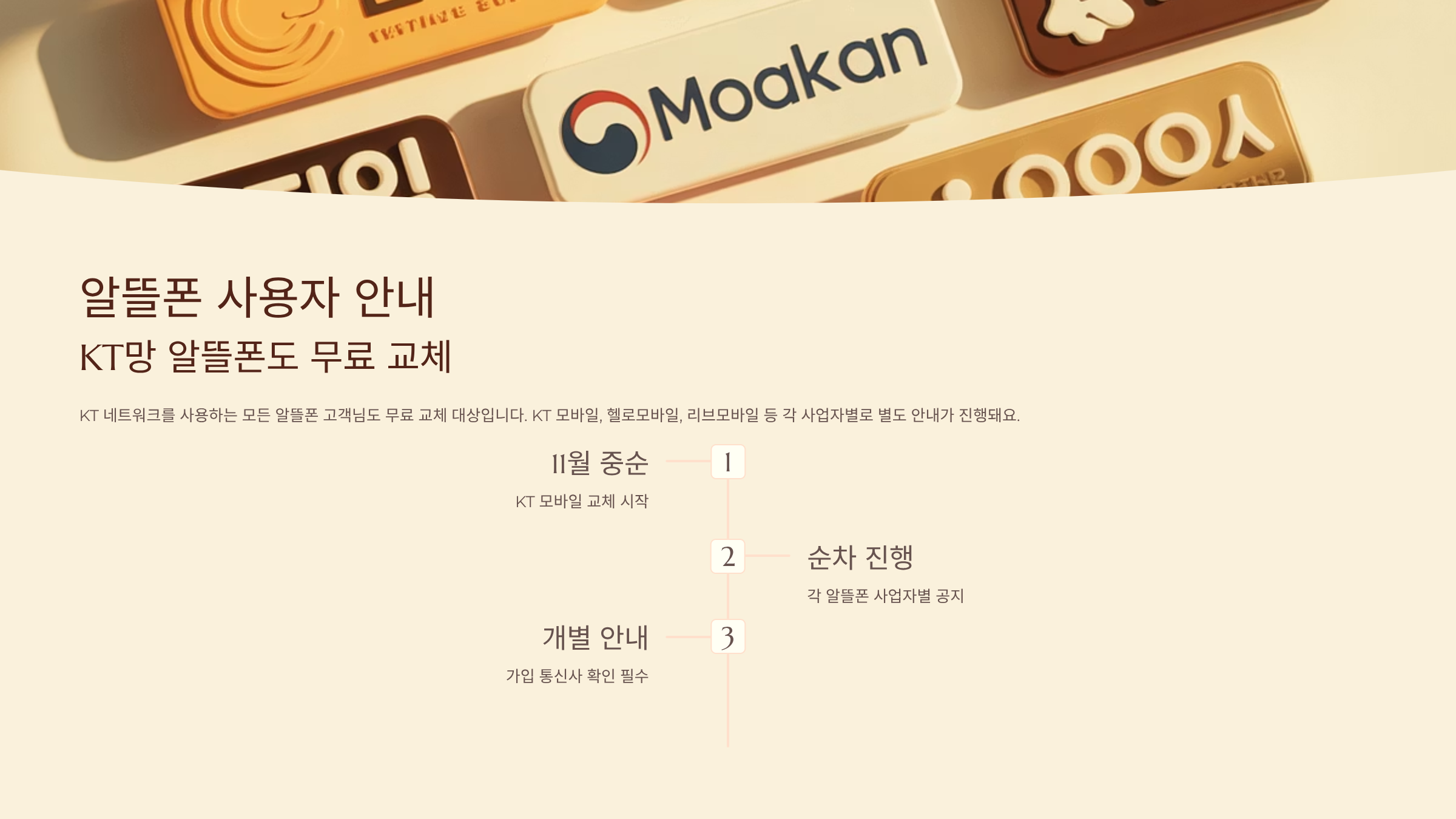 KT망을 사용하는 알뜰폰 고객님들도 걱정하지 마세요. 여러분도 모두 무료 교체 대상에 포함돼요. KT 모바일, 헬로모바일, 리브모바일 등 KT 네트워크를 빌려 쓰는 모든 알뜰폰 사업자의 고객이 해당돼요.