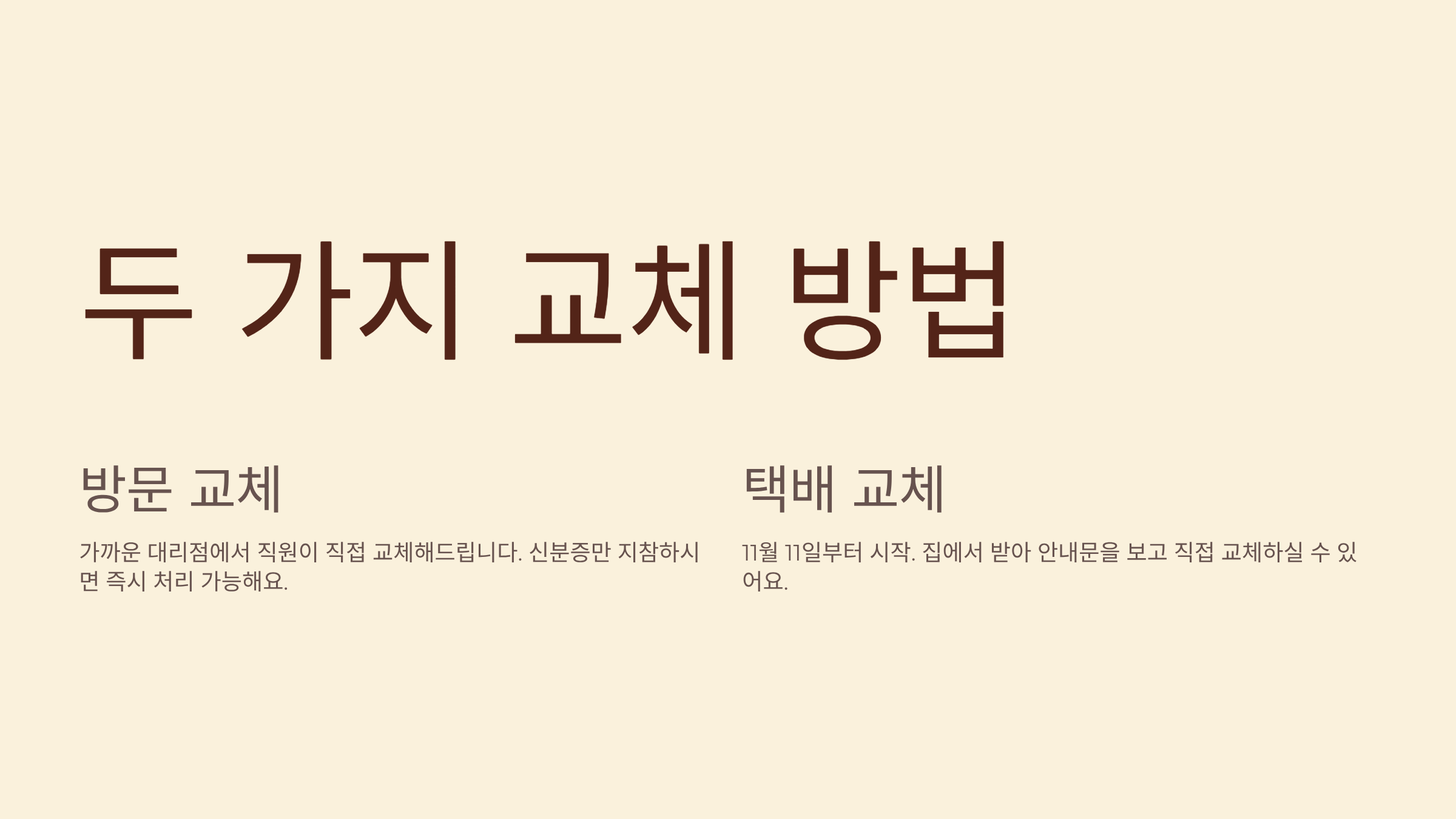 A10. 현재까지 명확한 기한은 발표되지 않았어요. 하지만 보안을 위해 가능한 빨리 교체받으시는 것을 권장해요.