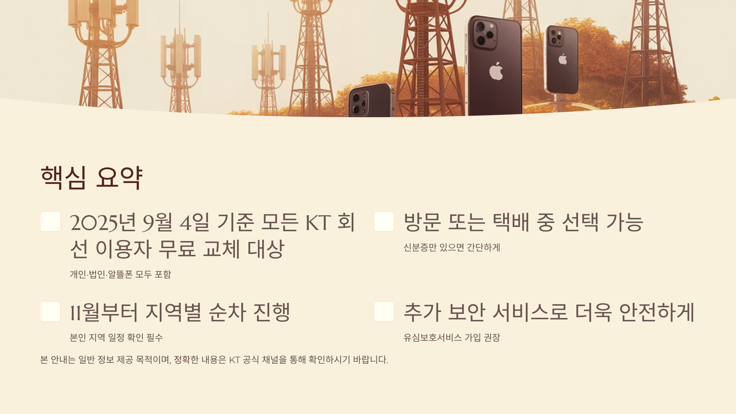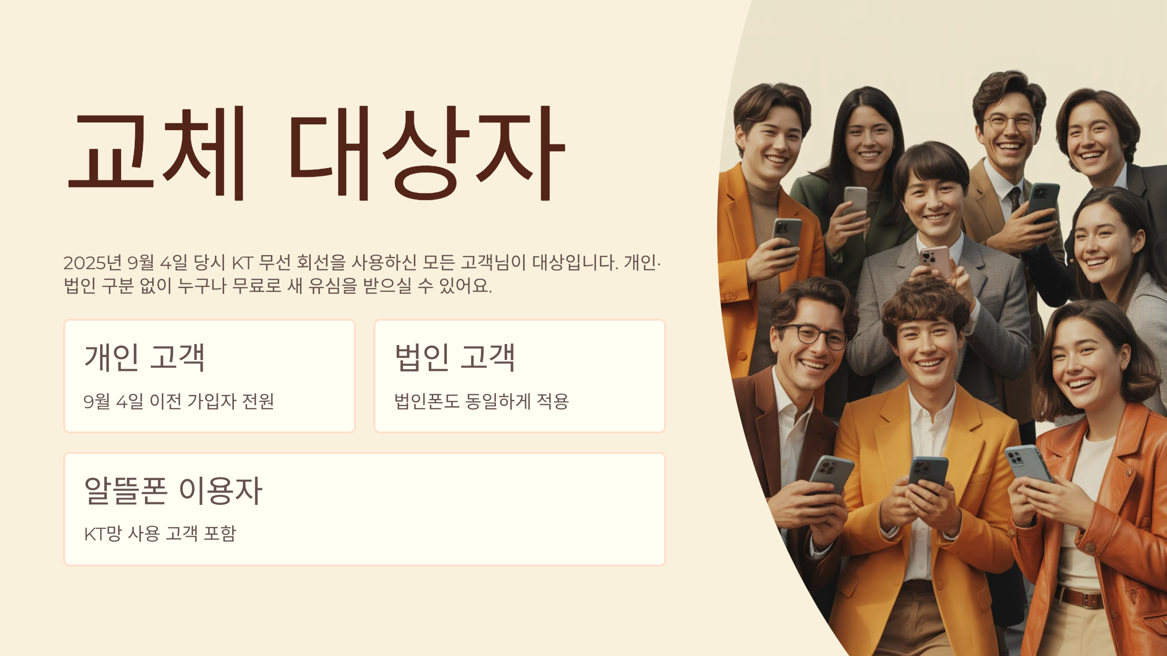 2025년 9월 4일 기준으로 KT 무선 회선을 사용하고 계신 모든 분들이 대상이 되는 만큼, 이번 기회를 놓치지 마시고 꼭 교체받으시길 바라요.