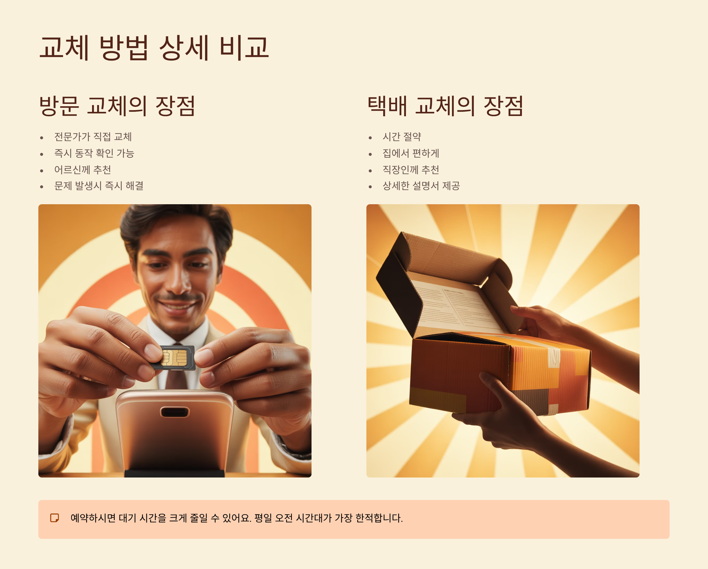 방문 교체는 가장 확실한 방법이에요. KT닷컴이나 전담 센터에서 예약 후 가까운 대리점을 방문하면 직원이 직접 교체해줘요. 신분증만 가져가면 되고, 교체 후 바로 통화와 데이터 연결 상태를 확인할 수 있어 안심이 돼요. 특히 스마트폰 조작이 어려우신 어르신들께 추천해요.