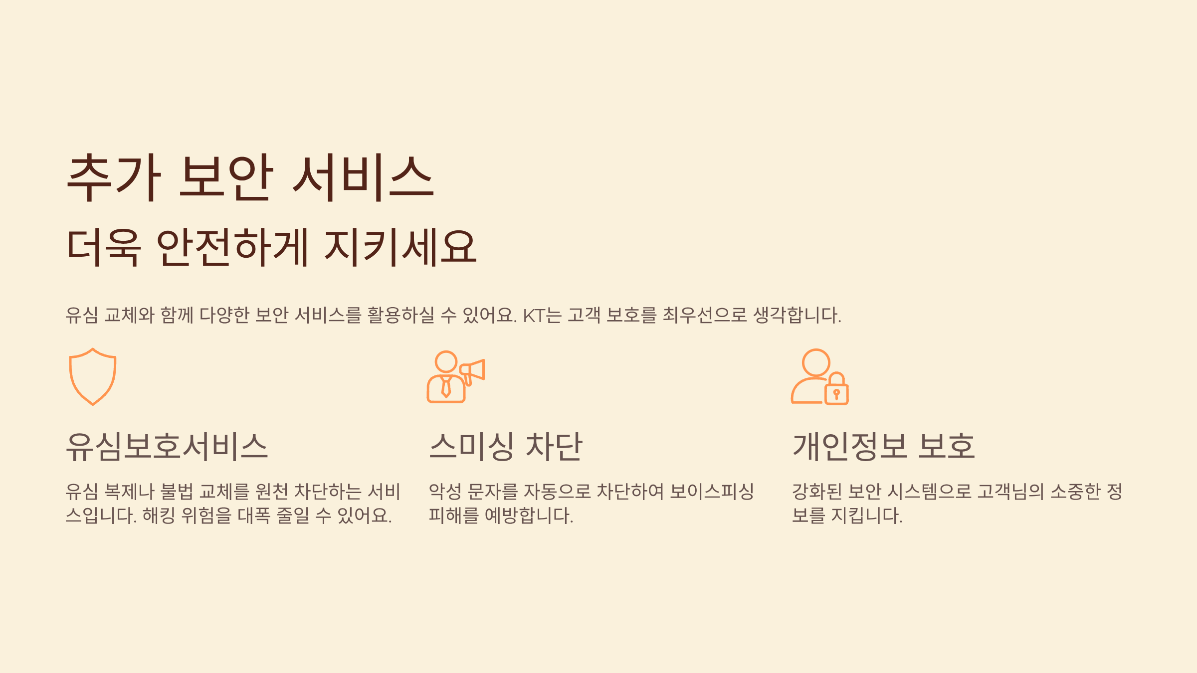KT는 유심 교체와 함께 다양한 보안 서비스도 제공해요. 대표적인 것이 유심보호서비스예요. 이 서비스에 가입하면 유심 복제나 불법 교체를 원천 차단할 수 있어요. 월 이용료가 있지만 보안을 위해서라면 충분히 가치 있는 투자예요.