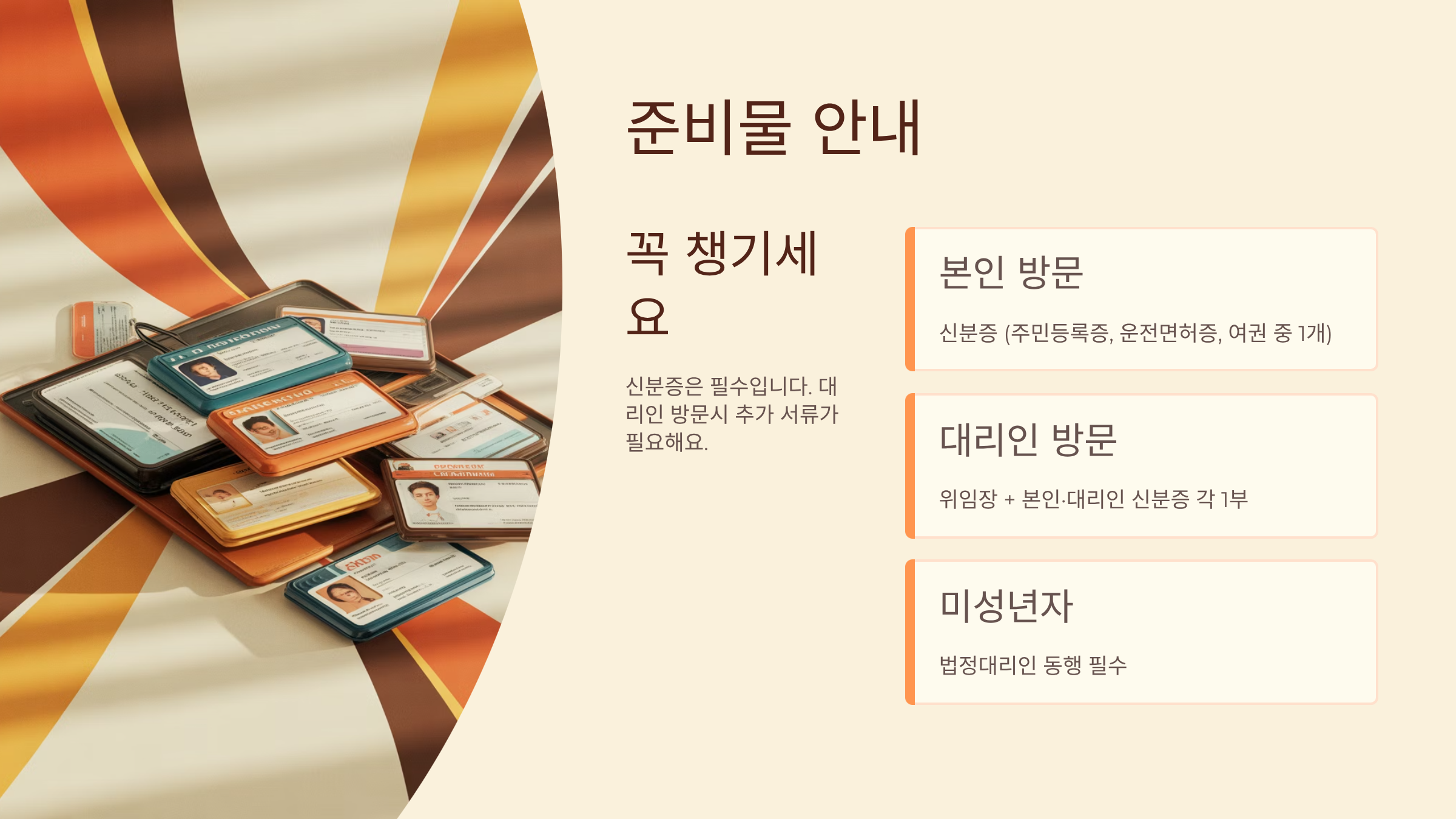 방문 교체 시 꼭 필요한 준비물은 신분증이에요. 주민등록증, 운전면허증, 여권 중 하나만 있으면 돼요. 미성년자의 경우 법정대리인 동행이 필요하고, 대리인 방문 시에는 위임장과 양쪽 신분증이 모두 필요해요.