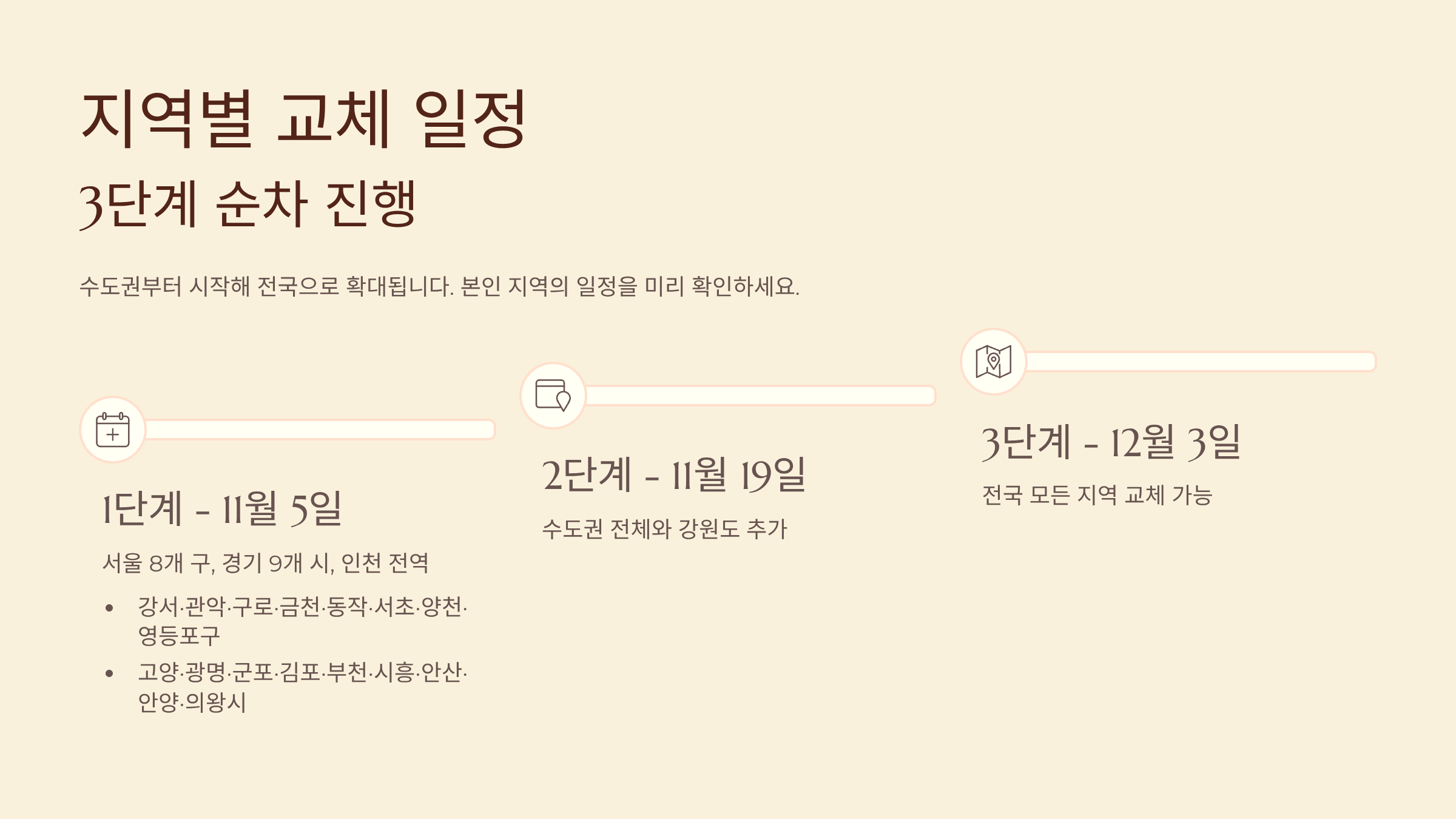 2단계는 11월 19일부터예요. 수도권 전체와 강원도가 추가돼요. 3단계는 12월 3일부터 전국 모든 지역에서 교체가 가능해져요. 지방 거주자분들도 조금만 기다리시면 곧 교체받을 수 있어요.