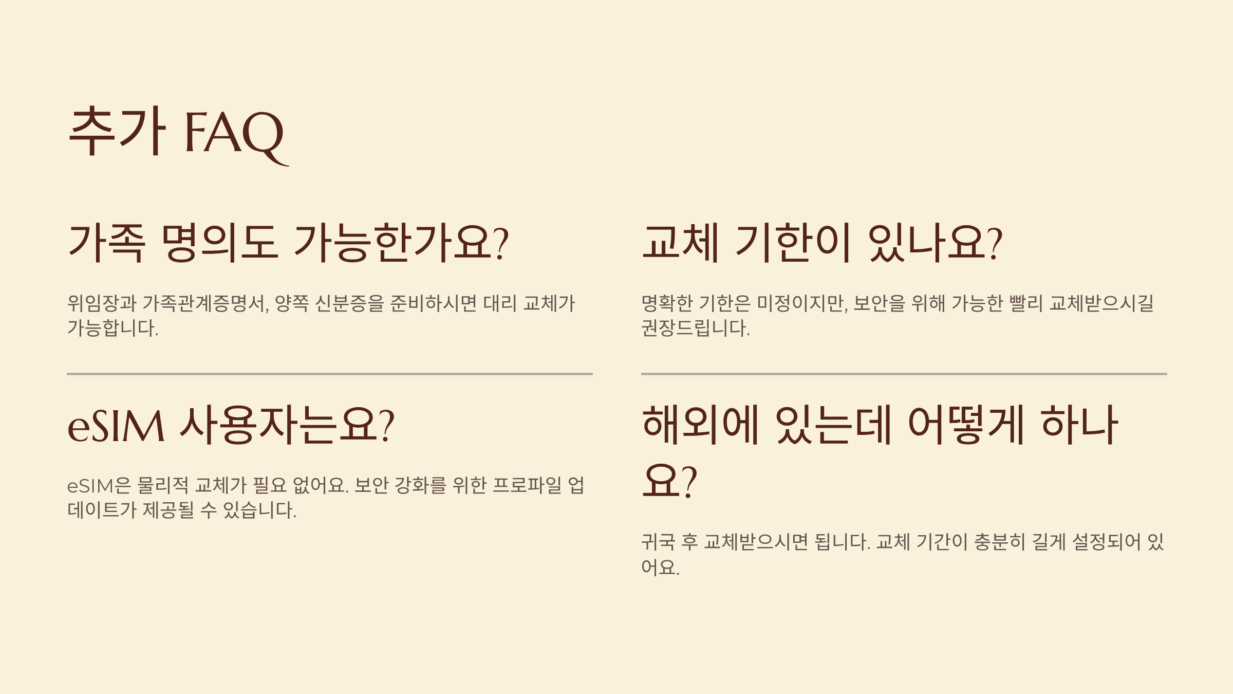 A9. eSIM은 물리적 교체가 필요 없어요. 다만 보안 강화를 위한 프로파일 업데이트가 제공될 수 있으니 공지사항을 확인해주세요.