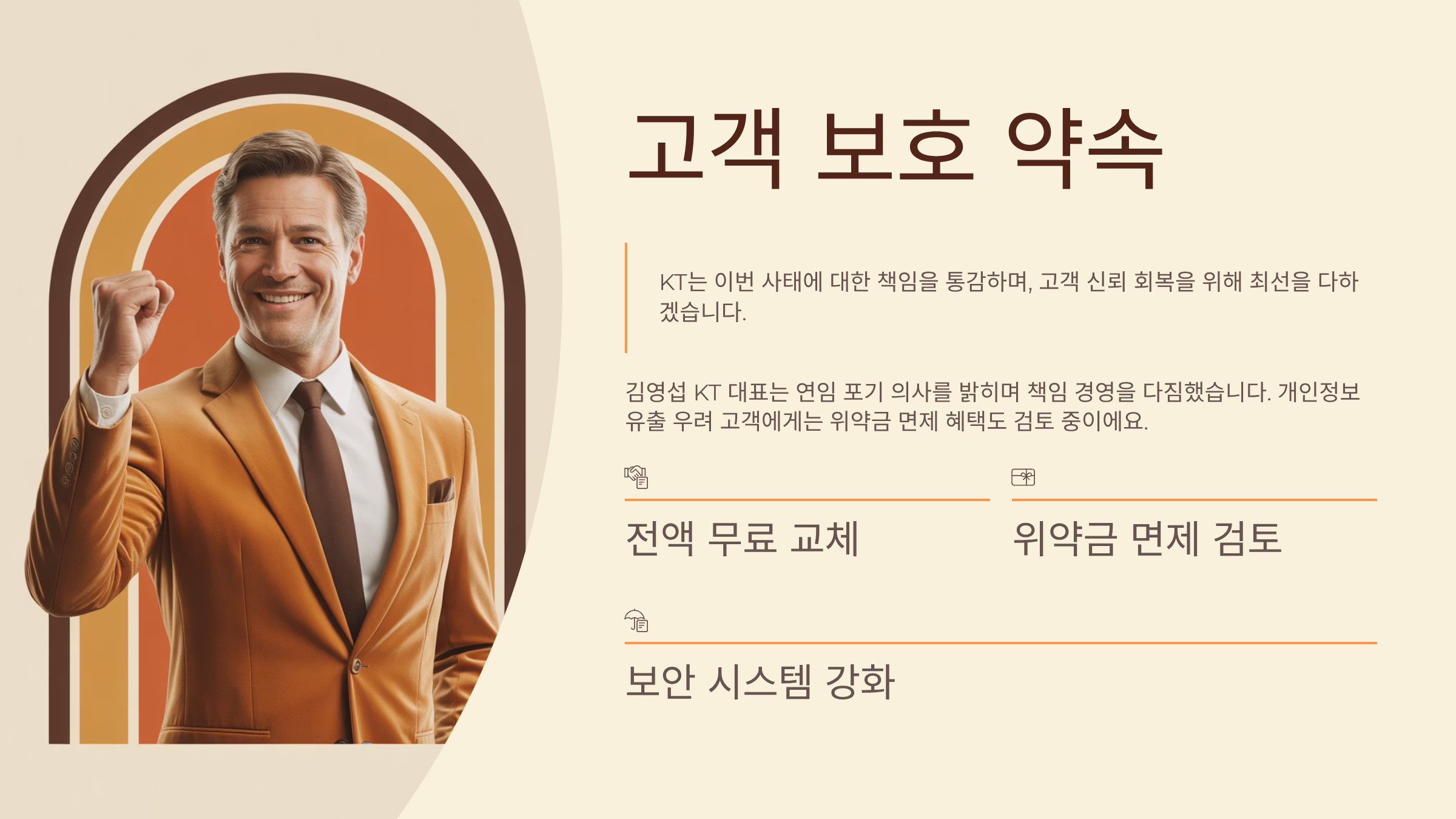 이번 사태와 관련해 개인정보 유출을 우려하는 고객에게는 위약금 면제 혜택도 검토 중이에요. 민관 합동 조사 결과가 나오면 구체적인 방안이 발표될 예정이니 조금만 기다려주세요. KT는 고객 피해 최소화를 위해 최선을 다하고 있어요.