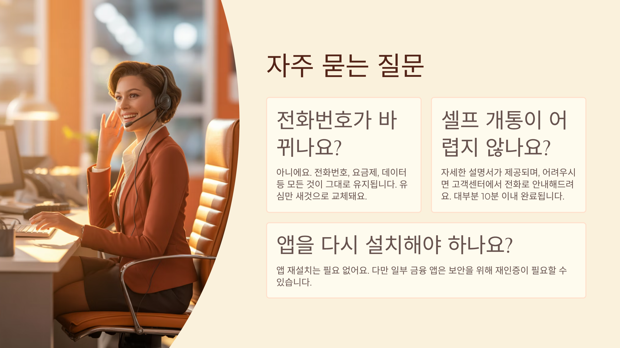 A2. 아니에요. 전화번호는 그대로 유지돼요. 유심만 새것으로 교체하는 것이라 번호, 요금제, 데이터 등 모든 것이 그대로예요.
